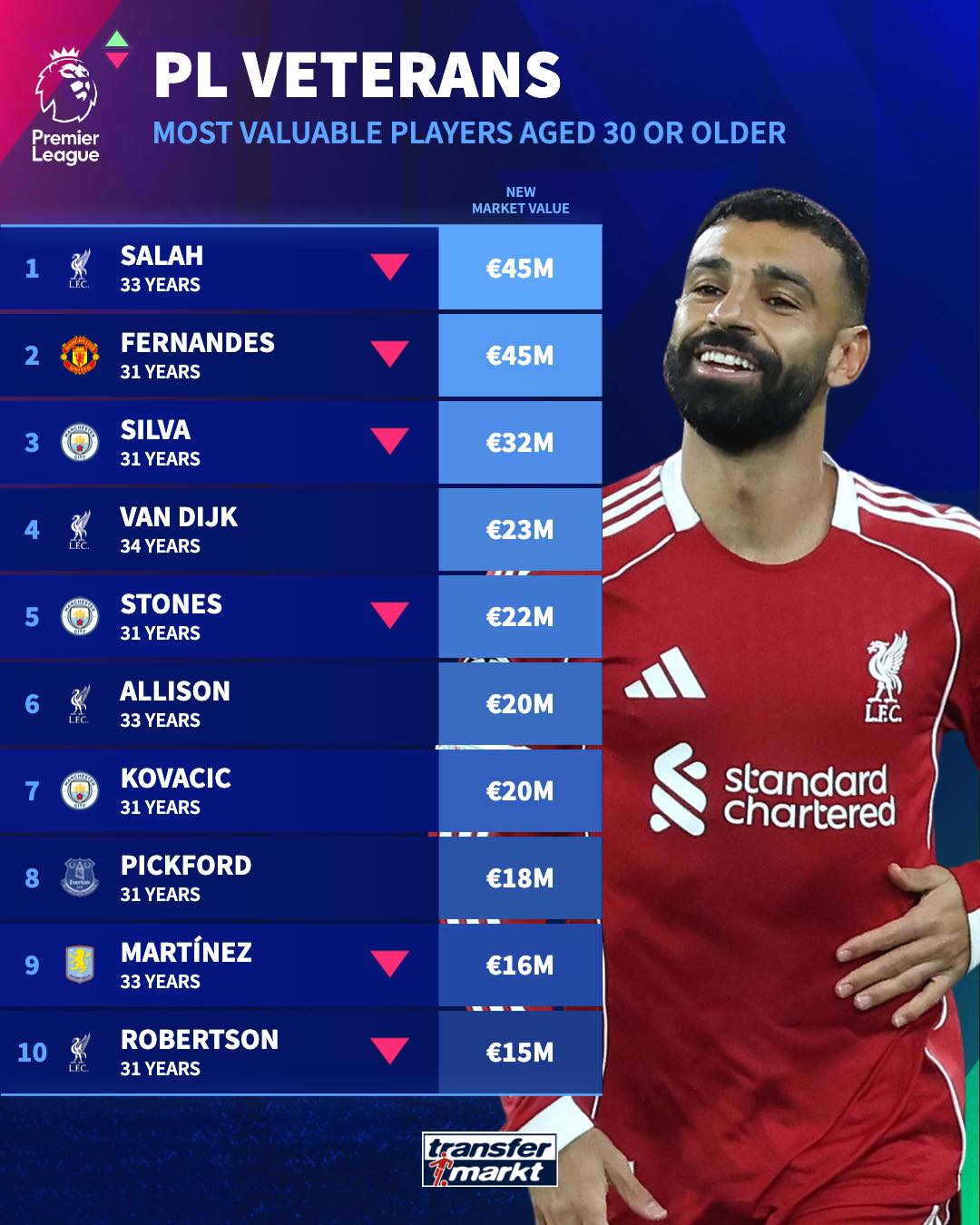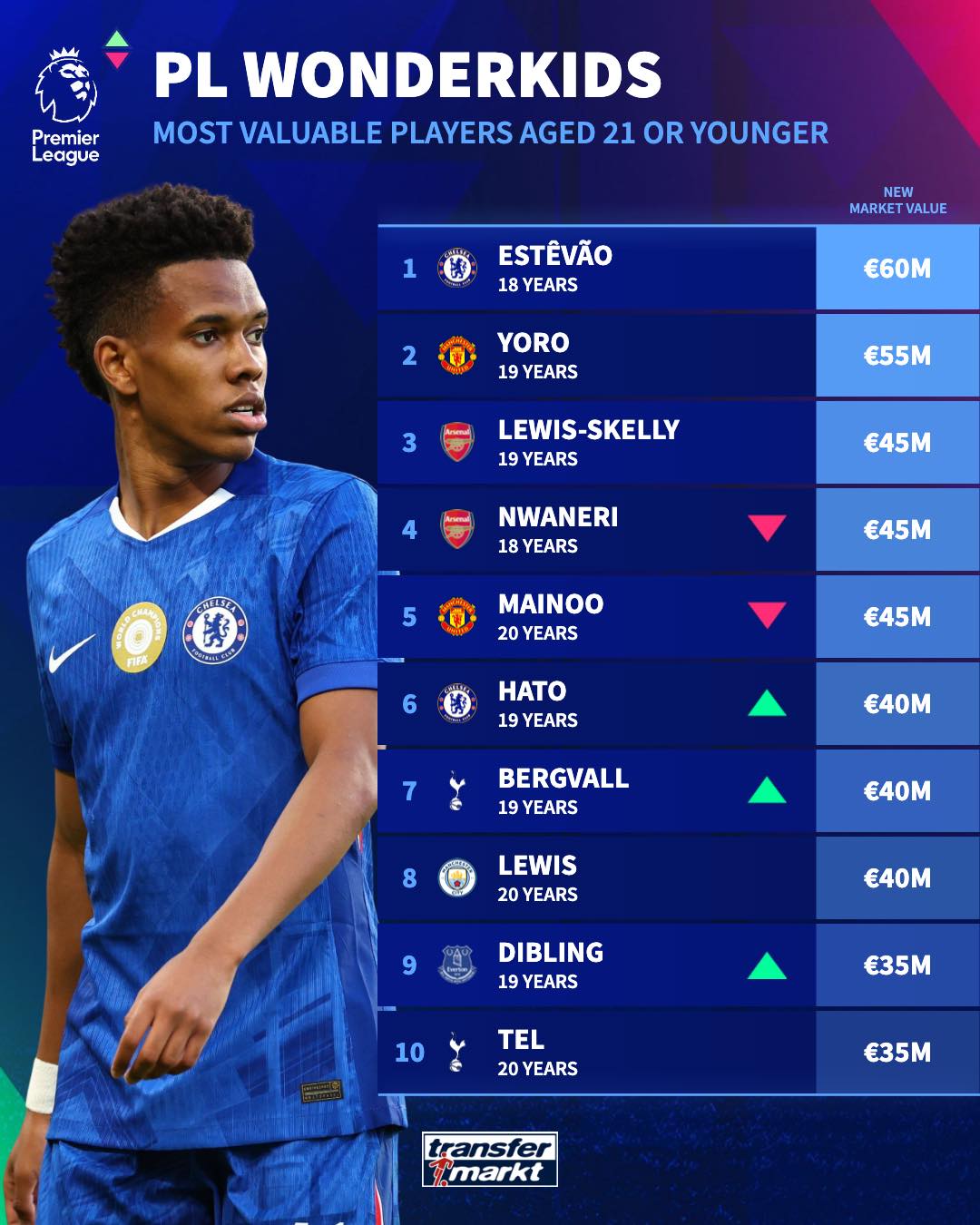 德转列英超U21&30岁以上球员身价榜:年少有为与老兵不死